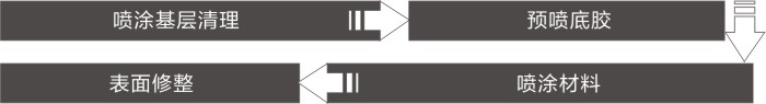 无机矿物纤维吸音喷涂材料采用机械喷涂工艺进行,基层必须是干净的混凝土或者物体的表面,尤其应注意不能有漏水痕迹,不可在基层上留有油污和蜡质物体,如原基面已经损坏或有严重裂缝,应先进行修补。对门窗及各种设备、管线和非喷涂部位防护遮挡,堵塞非喷涂部位及通风管线、孔。基层表面清洁后,即可使用已配好的喷涂胶粘剂对基面预喷胶处理,胶量适当和均匀,不流淌。按照设备操作说明调验喷涂主机风压,胶泵压力和给料装置,通过样板试喷、对胶液流量和出棉量进行测量,逐步调整风压、胶压范围和进料搅拌速度,直到纤维喷涂状态稳定,达到喷涂工艺的要求,当喷涂厚度较厚时,可分多次喷涂,并根据实际喷涂状况附加相应的锚固件支撑。待喷涂产品层干燥约0.5h后,根据保温或吸声的不同要求使用毛滚、铝辊、压板或铝合金杠尺等不同整形工具进行表面整形。在整形后的涂层表面再次喷涂胶粘剂面涂层,以增强表面强度,如设计要求表面着色,可在面涂层完工后喷涂色浆或涂料着色。