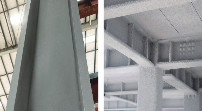 遇火时由于非膨胀型防火涂料自身的涂层厚度以及较低的导热系数形成较好的隔热涂层,阻隔火焰对钢结构直接加热的速度,避免钢结构快速升温,从而提高钢结构的耐火时限。