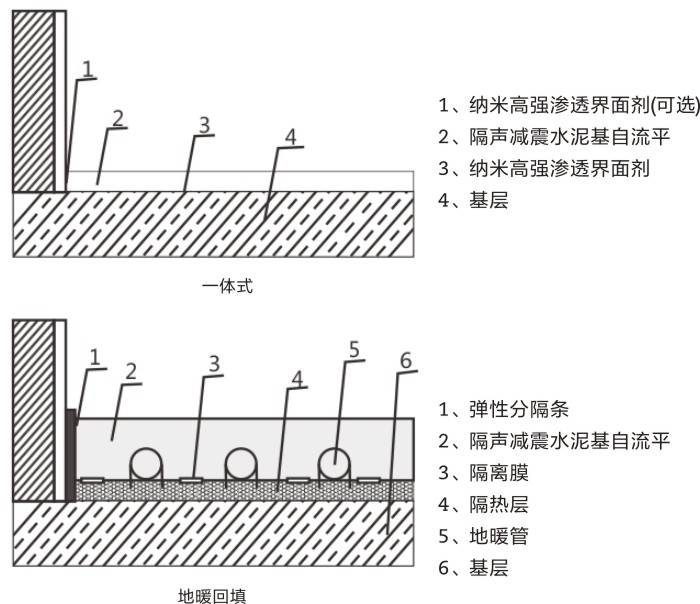 基层必须干燥、坚固、可承重、无尘、无妨碍粘接杂物,表面平整;具有良好的抗压强度;为保证自流平表面强度和附着力,建议使用纳米高强渗透界面剂处理。